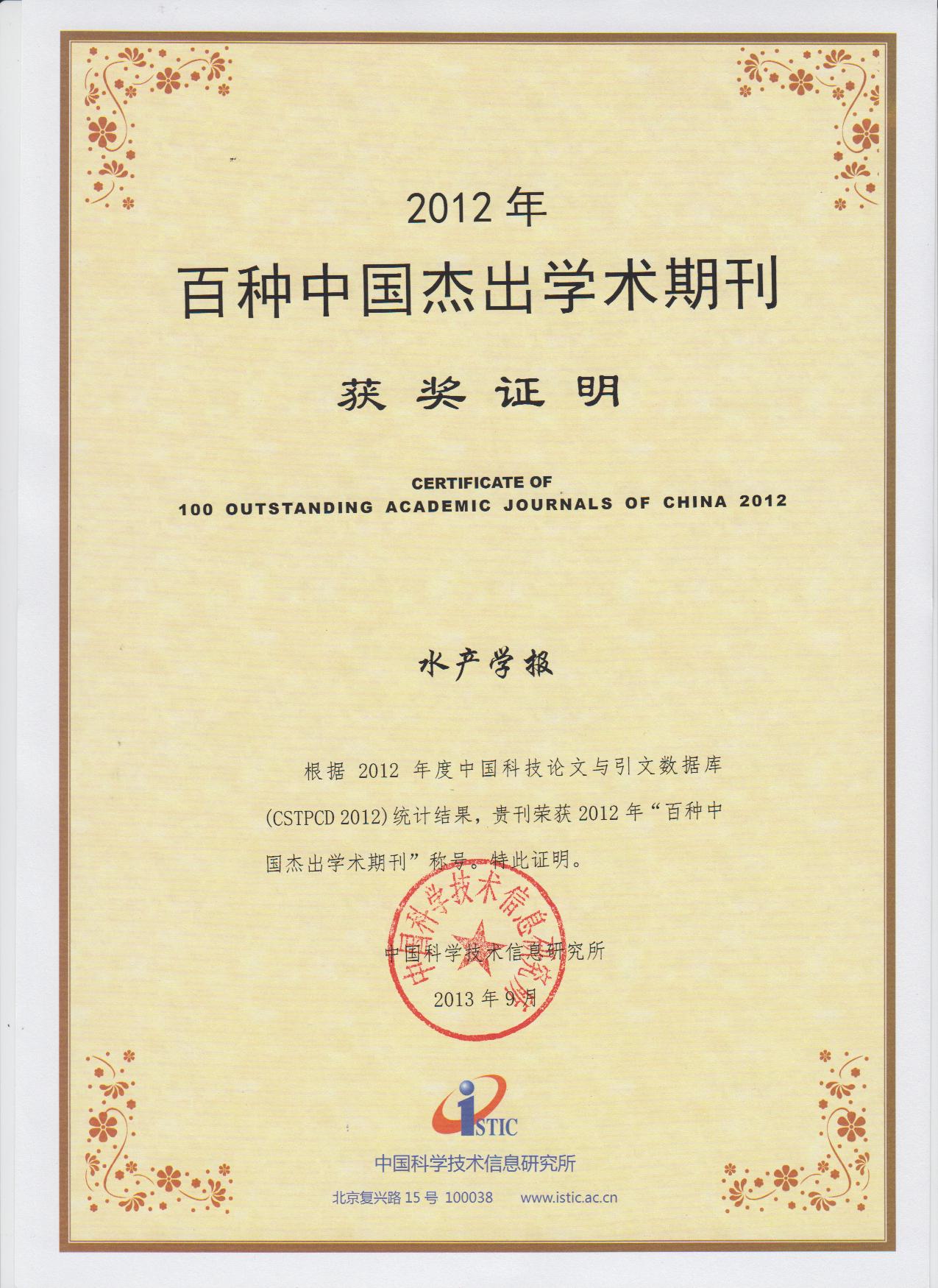 2013年9月27日,中国科技论文统计结果发布会在北京国际会议中心举行,大会公布了2012年度“百种中国杰出学术期刊”获奖名单。由我会主办,上海海洋大学承办,黄硕琳教授任主编的《水产学报》获此称号。