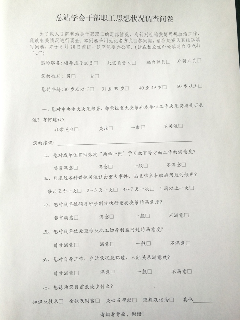 6月下旬,按照部直属机关党委《中共农业部党组关于进一步加强和改进新形势下思想政治工作的意见》有关要求,全国水产技术推广总站、中国水产学会积极贯彻落实,认真组织开展了2017年上半年干部职工思想状况调查分析,就干部职工思想状况进行了调查了解。领导班子将广泛吸纳大家对单位发展建设的意见建议,认真对待,推动总站学会更加稳定健康发展。