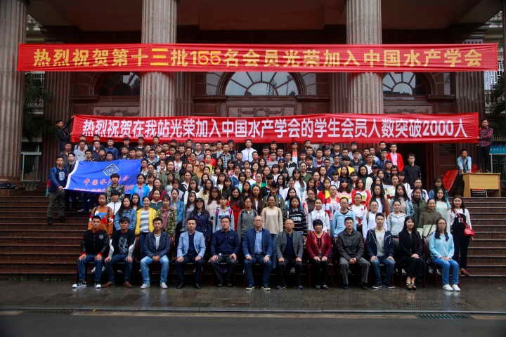 在第二教学楼前,“热烈祝贺第十三批155名会员光荣加入中国水产学会”的横幅拉起,全体新会员齐聚一堂,场面壮观。新会员们都意气风发,脸上洋溢着欢快的笑容。