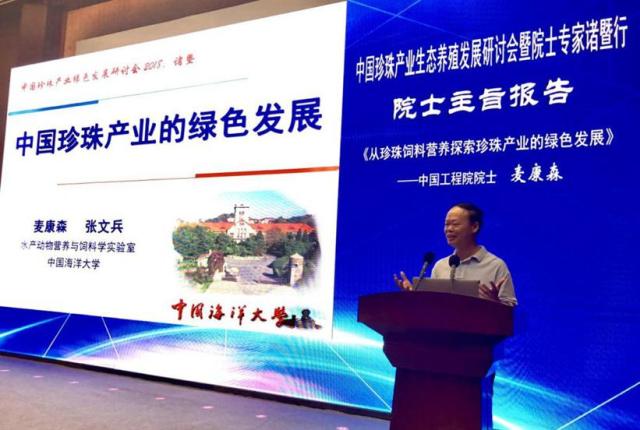 在专题报告环节,中国工程院院士麦康森做了题为《中国珍珠产业的绿色发展》的主旨报告,提出了我国珍珠养殖产业高产低质的现状与我国珍珠产业的绿色发展之路。麦院士在报告中强调,目前我国的珍珠产量占世界95%,而产值只占10%。我们再也不能以环境和资源为代价去发展珍珠养殖,提质增效、减量增收,以科技引领绿色发展是振兴我国珍珠产业和提升国际竞争力的关键。湖州师范学院副校长叶金云研究员从淡水池塘珍珠养殖减污处理技术和病害防治指导企业如何发展生态养殖方式;上海海洋大学副校长李家乐教授从育珠蚌的选育与珍珠的品质,指导企业如何培育出高品质、具有国际竞争力产品;中国水产科学研究院淡水渔业研究中心主任徐跑研究员从新品种的引进展示了的珍珠产业的科技创新成果;上海海洋大学刘晓军博士从国际视野介绍珍珠的结构成份和加工技术的发展方向。
